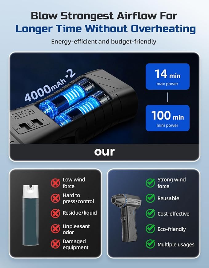 - Fast Charging Air Blower: Powered by two 4000mAh batteries, the air duster offers extended runtime from 15 to 100 minutes. The Type-C fast-charging port ensures quick replenishment, it fully charges only need 2.5H.