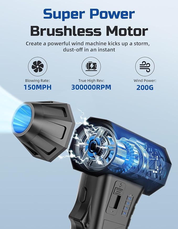 - Quick Clean and Effective Turbo Fan: Equipped with a high-speed 300,000 RPM brushless motor, this powerful performance blower delivers a maximum airflow of 200g, enabling rapid removal of dust, debris, and fine particles with exceptional efficiency. It is the best alternative to canned air.
