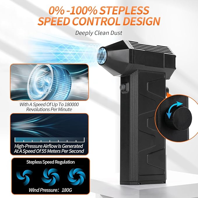 - 🔹【180,000 RPM High-Speed Air Duster for Electronics】 Blasts away dust and debris with a turbo motor spinning up to 180,000 RPM. Perfect compressed air alternative for cleaning PC, keyboard, laptop, camera, or console.