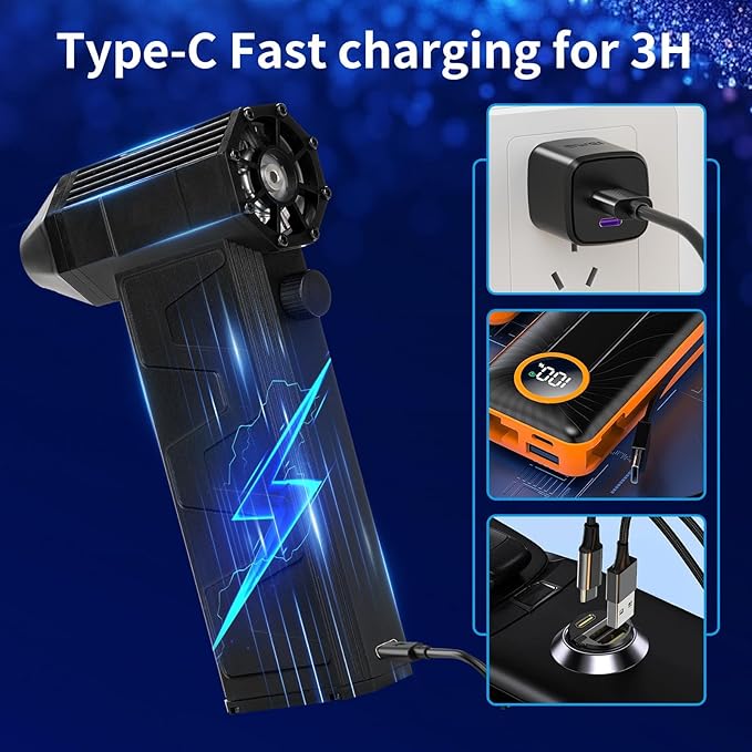 - 🔹【Fast USB-C Charging & Long Battery Life】 Recharge fully in just 3.5 hours via USB-C. Offers up to 240 minutes runtime on low speed. Compatible with power banks, wall adapters, and car chargers.