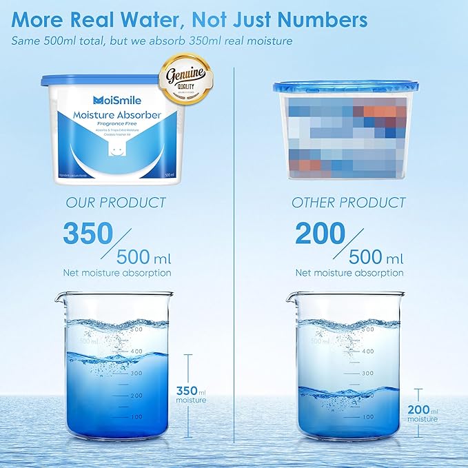 - Lasting Moisture Control: Moismile moisture absorber for closet features 74% high-concentration calcium chloride, providing a 133% absorption rate that results in significantly higher real water capture—far exceeding other similar products. Thanks to the large absorption capacity, each closet humidity absorber lasts up to 60 days, offering long-term basement water absorber without frequent replacements.