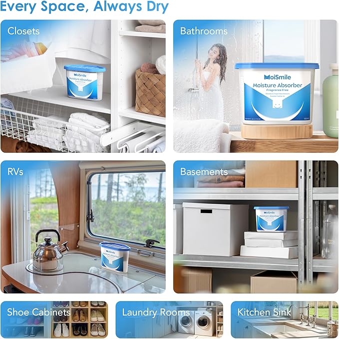 - Portable Use: Moismile moisture absorbers for closet are portable and easy to use, ideal for small spaces like closets, bathrooms, cars, basements, and storage rooms. Just open and place. No power needed. They act as humidity absorber and odor absorber where large dehumidifiers can’t reach.