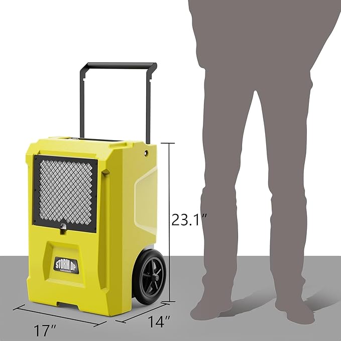 - Portable and Convenient to Use: Measures 17 x 14 x 23.1 inches with 58 lbs weight, this large space commercial dehumidifier includes a handle covered with protective foam and 2 wheels for easy transport. Sufficient capacity card slot set above the dehumidifier for a 19.6' power cord and 19.6' condensate hose storage