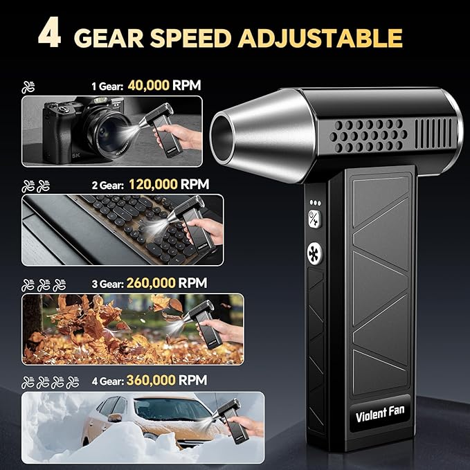 - ✅Versatile Multi-Purpose Use: With 4 adjustable speed settings, this powerful air duster is ideal for a wide range of cleaning tasks—from keyboards, computer cases, and air conditioners to sofas, bedding, and car interiors. It’s also great for starting campfires or drying pet hair.
