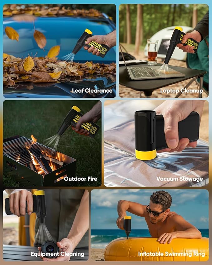 - 【Multi-functional Cleaning Tool】This versatile air duster comes with 5 nozzles and 9 brushes, making it perfect for a variety of cleaning tasks. Whether you're cleaning keyboards, computer towers, air conditioning vents, or car window blades, this air blower duster does it all. It’s also ideal for removing crumbs from your sofa, drying pet hair, inflating camping gear, clearing snow, or even acting as a turbo fan to cool you down. A must-have for any household, car, or outdoor enthusiast!