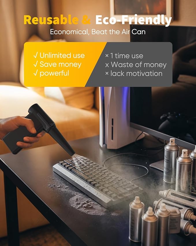 - 【Eco-Friendly & Cost-Effective Alternative】 Say goodbye to one-time-use air cans. This compact 6-inch air duster is lightweight and portable, yet powerful enough to clean tight spaces like inside your computer case or under your car seat. Rechargeable and reusable, it saves you money and reduces waste.