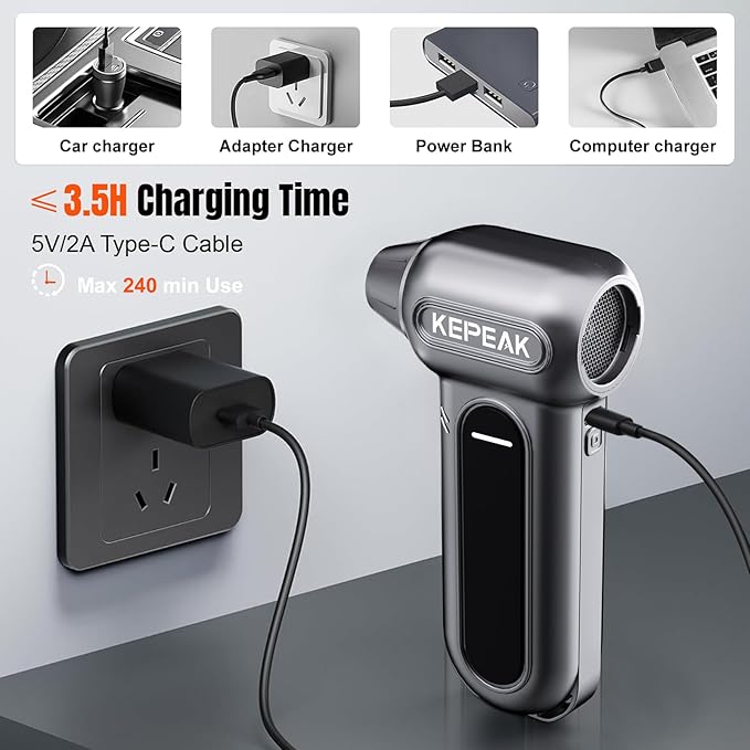 - Cordless & Rechargeable Air Duster: Enjoy the freedom of cordless operation with a built-in 4000mAh rechargeable battery and USB Type-C fast charging. The air duster rechargeable design ensures up to 110 minutes of continuous use on low speed and quick recharging in just 3.5 hours.