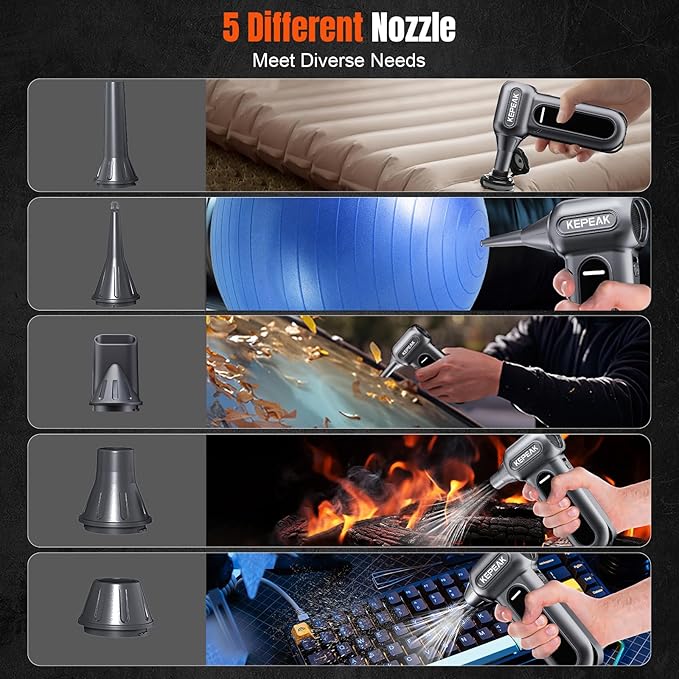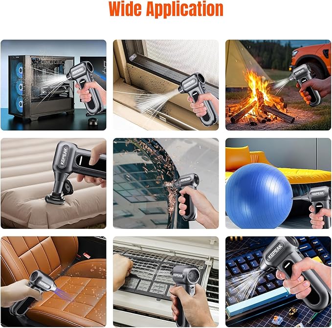 - KEPEAK Compressed Air Duster with Brushless Motor: Experience high-speed cleaning with our electric air duster, featuring a brushless motor that delivers up to 130000 RPM and 200W max power for efficient dust removal on electronics, keyboards, and PC components.