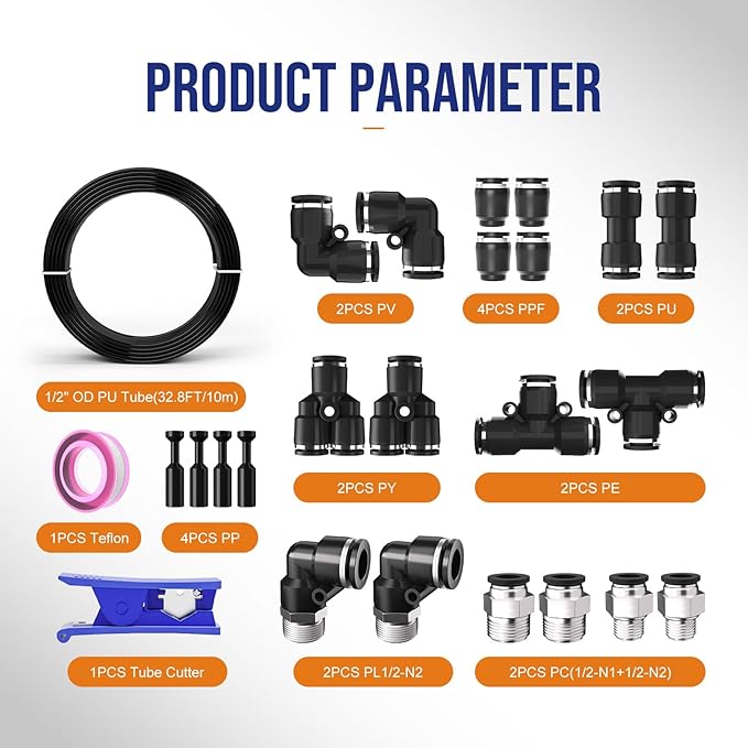 - PACKAGE : 1xPU Tube 1/2" OD (Black 32.8FT/10M) ,Each 2 pcs NPT Thread PC 1/2-N2,PC 1/2-N1,PL 1/2-N2, Each 2 pcs Plastic 1/2 PU+PV+PE+PY, Each 4pcs PP+PPF,1x Teflon Tape,1xHose Cutter