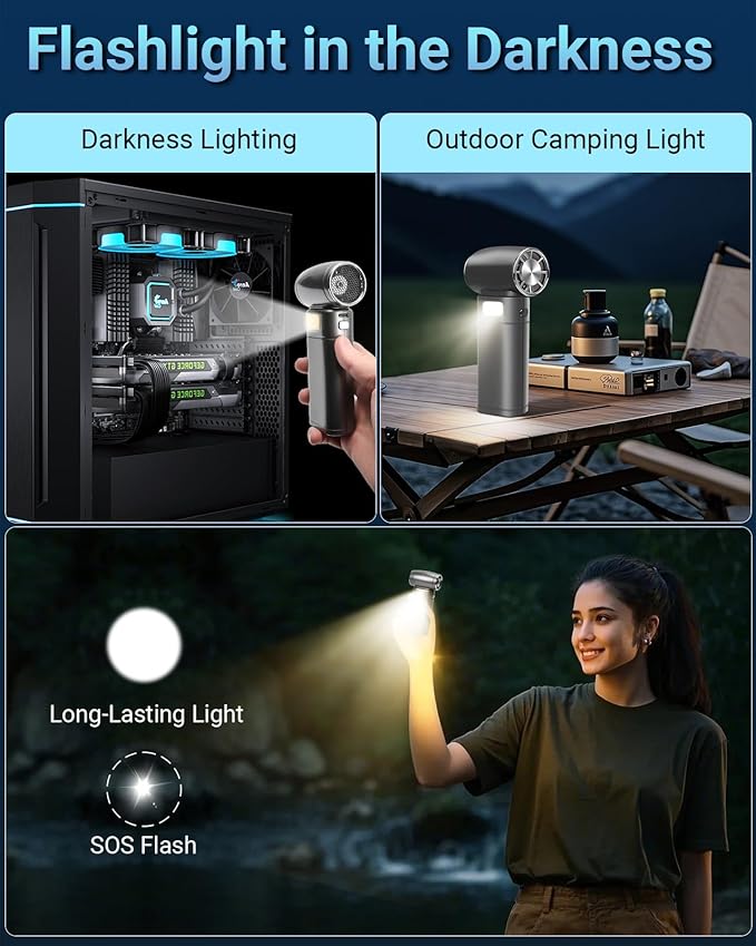 - đă9000mAh Long-lasting Battery & Emergency LightingăHandheld fan equipped with a powerful 9000mAh battery, portable turbo fan lasts 3â4 hours of continuous use. Built-in LED light with SOS flashing mode keeps you safe and visible during outdoor adventures, camping, or power outages. Built-in over-voltage and over-current protection ensure worry-free use. Perfect for concerts, travel, sports events, or outdoor adventures.