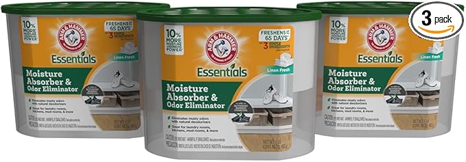 Arm & Hammer Essentials Disposable Moisture Absorber and Odor Eliminator Tub, Linen Fresh, 1 lb., 3-Pack, Attracts and Traps Excess Moisture, Ideal Closet Non-Electric Dehumidifier