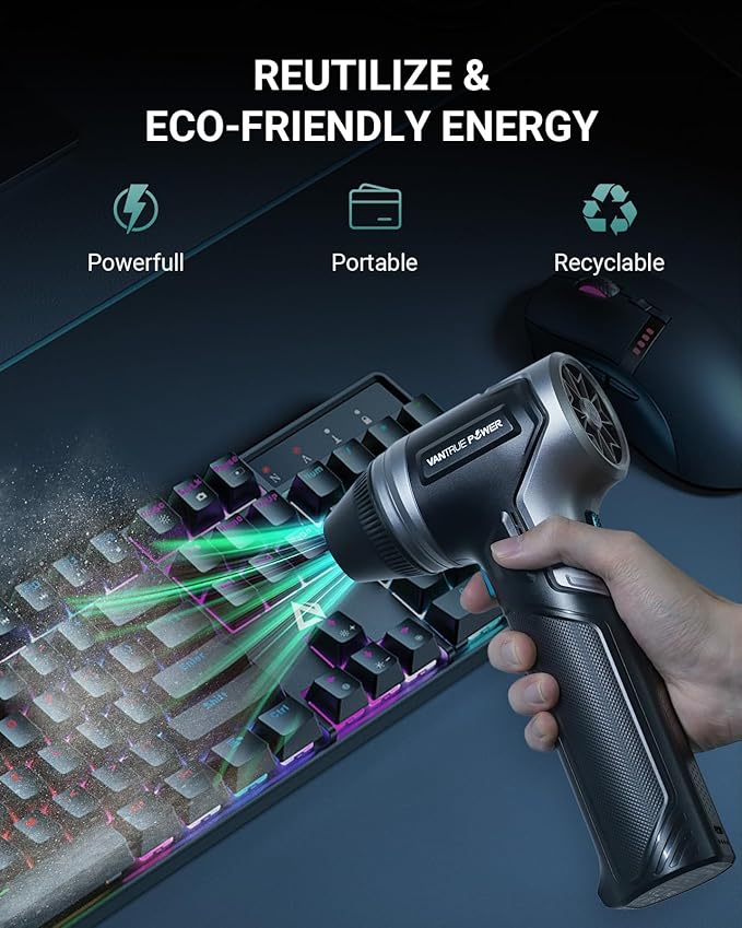 - Eco-Friendly & Budget-Smart:Built with durable materials, the VANTRUE POWER air duster delivers long-lasting battery performance and can be reused over 500 times. It’s a greener, more cost-effective replacement for single-use compressed air cans—better for both your budget and the environment.