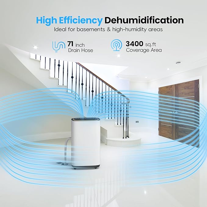 3400 Sq.Ft Dehumidifier, 34PT/24H Dehumidifiers with Drain Hose for Home, Large Compressor Dehumidifier for Basement/Laundry/Bedroom/Office, Dehu/Dry/Air Mode, Humidity Display/Timer/Child Lock