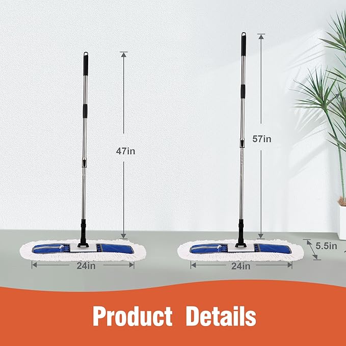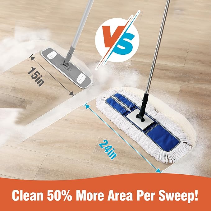 - 24" Wide Commercial Dust Mop – Effortlessly clean large hardwood floors, garages, and industrial spaces with an extra-wide 24-inch head, dominating high-traffic areas for faster surface coverage.