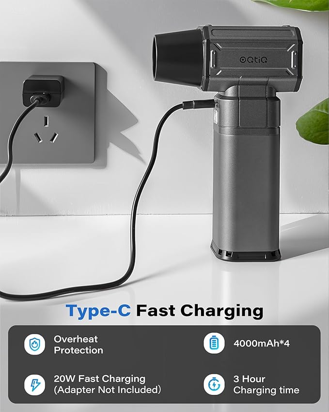 - Fast Charging & Long Runtime: The cordless air duster built in 4000mAh*4 batteries, which can provide up to 100 minutes of runtime on the 1st gear and last up to 19 minutes longer in Turbo mode. Type-C fast charging, let you Keep cleaning without pause.