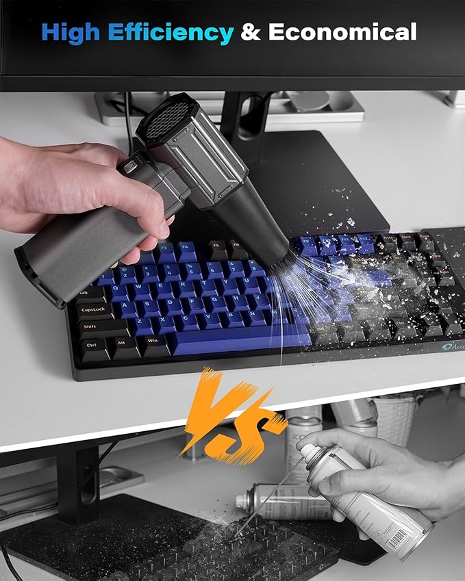 - Multi-Use Versatility: Equipped with 3 nozzles and 1 brush, this rechargeable air duster is perfect for cleaning PCs, keyboards, home and outdoor use. As well as efficiently blowing away leaves water spots on car. The pc cleaner air duster is also ideal for managing campfires when camping