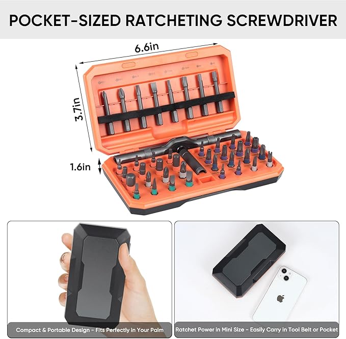 - 【Ultra-Portable Mini Screwdriver Set】Ergonomic slim case (6.6”x3.7”x1.6”) fits in toolboxes or backpacks. Lightweight yet sturdy for on-the-go repairs at home, workshops, or outdoor projects.