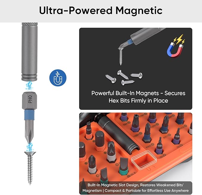 - 【Strong Magnetic Grip】Built-in handle magnet secures bits firmly. Compact case includes magnetizing slot to restore magnetic strength. Color-coded rings for quick bit identification.