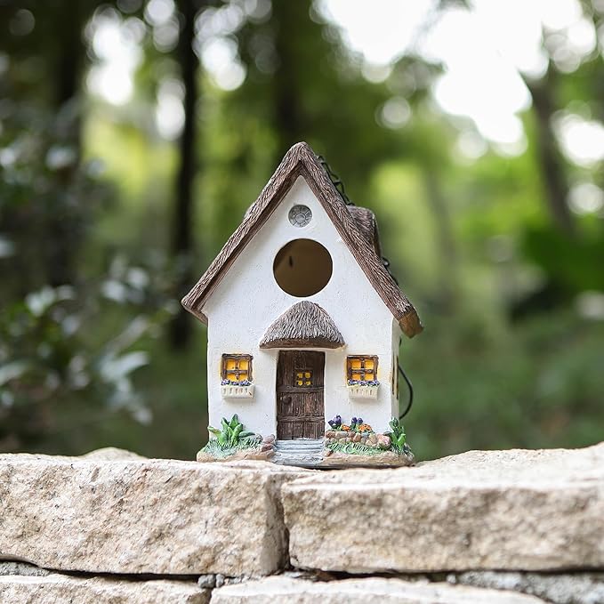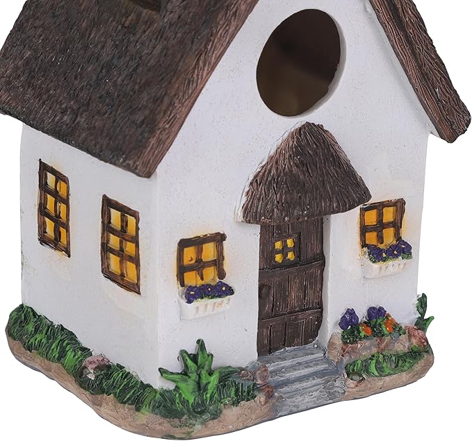 White Resin Cottage Bird House Brown Roof, 1.5" Entry Hole for Small Birds Wrens Sparrows, Rustic Cottage Style Nesting Box, Weatherproof Backyard Garden Decoration