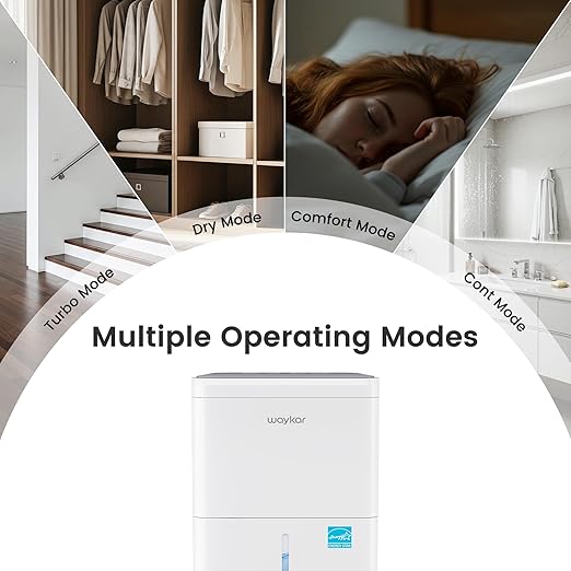 - 【Waykar 30 Pints for Spaces up to 2,000 Sq. Ft】Effectively extracts up to 30 pints of humidity per day (under 95°F, 90% RH), making it ideal for damp basements, humid homes, bedrooms, laundry areas, storage rooms, and bathrooms. Covers up to 2,000 sq. ft., helping reduce condensation and unpleasant odors to create a cleaner, drier, healthier living space. With a 15%–80% RH adjustable range, maintain full control of indoor comfort through all seasons—from muggy summers to wet winters