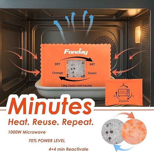 - [ Reusable & Easy to Rejuvenate ] Our desiccant packets can be easily rejuvenated by microwave (3-6 minutes at 700W) or oven (0.5-1 hours at 200°F). Simply follow the instructions and reheat once more after cooling if needed. Avoid overheating to prevent melting or scorching.