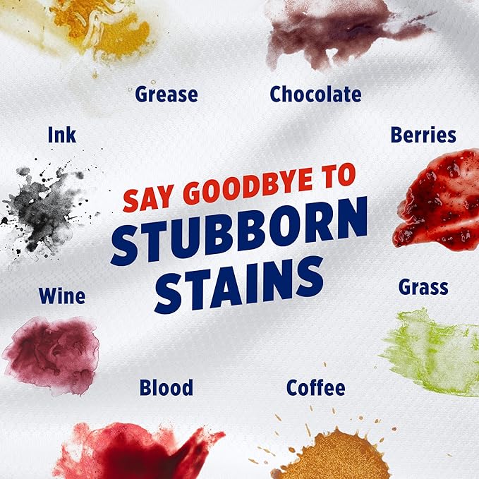 - TACKLES SET-IN STAINS THE FIRST TIME; no extra pre-wash needed to remove tough stains like berries, baby food, fruit juice, grass, mud, oil, grease, coffee, wine, chocolate, ketchup, blood, ink and washable paint