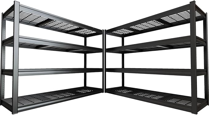 - 【Heavy-Duty Reinforced Metal Construction】Crafted with extra-thick, widened, and hardened steel, this 4-tier garage shelving unit delivers unmatched durability for long-term storage. The all-metal build ensures robust support, ideal for heavy tools, equipment, and bulky items. Each shelf consists of two metal mesh panels.