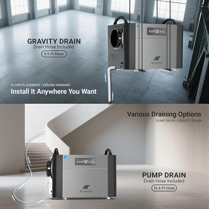 - [Built-in Functions] This crawlspace dehumidifer is equipped with the newly designed built-in water pump that can drain up to 16.4-ft (5m) in addition to the updated control panel with Humidity Level Setting, Timer and Gravity Drain (6.56-ft drain hose) functions to allow this tankless dehumidifier to offer the "Set-and-Forget" work mode.