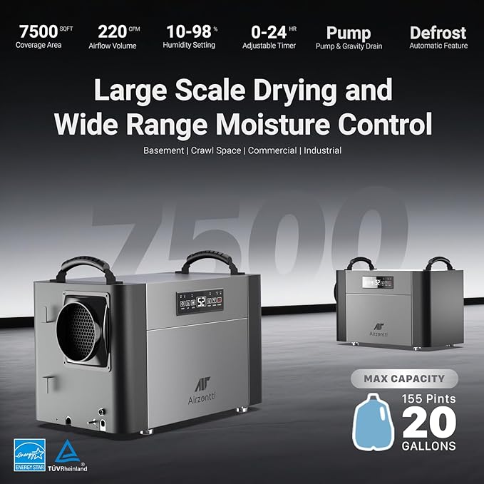 - [Commercial Grade Dehumidifier] This Airzentti crawl space dehumidifier with large capacity removes moisture from basement, attic, large room and small rooms efficiently up to 155 pints per day under nearly saturated condition (70 PPD in AHAM), with 220 CFM airflow, it is ideal for space up to 7,500 square feet.
