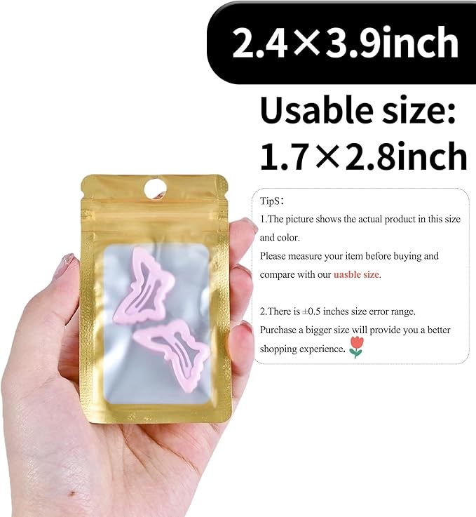 100 Pack Resealable Plastic Bags for Food Storage, Zipper Bags with Clear Front Window, Packaging Pouch for Small Business (Gold, 2.4x3.9 inch)