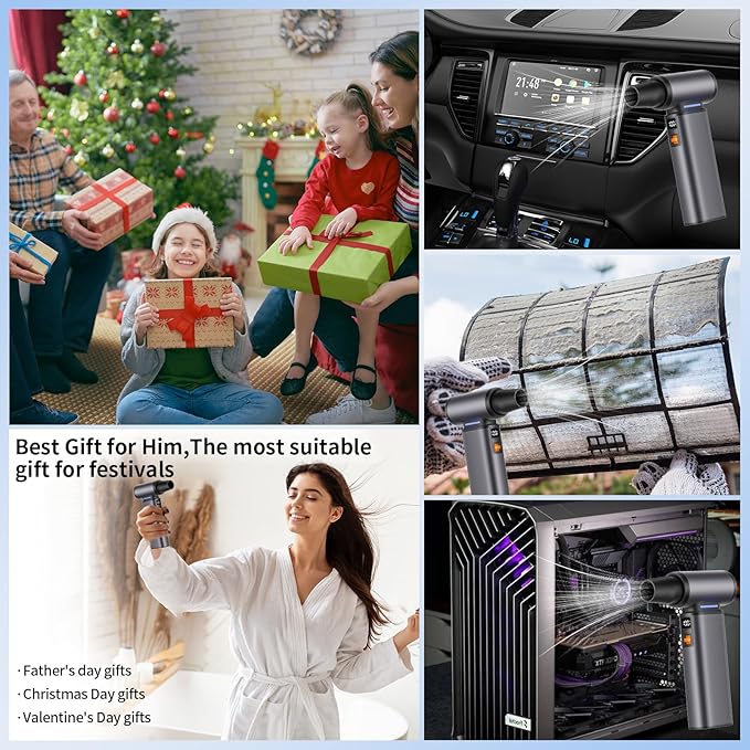 - 【Portable Compressed Air Duster】Compressed Air Dusters with our advanced 130,000 RPM brushless motor portable turbo fan handheld,generating a massive 56 m/s max wind speed to blast away the most stubborn dust.Electric duster have 100 gear stepless speed control allows you to dial in the perfect pressure,from a gentle breeze for delicate camera sensors to a powerful gust for blasting crumbs from a keyboard clearner or ash from a grill. This Mini blower duster Portable isn't a weak alternative to canned air,it's a powerful cordless air duster,reusable upgrade portable air blower,perfect as electronic Christmas gift