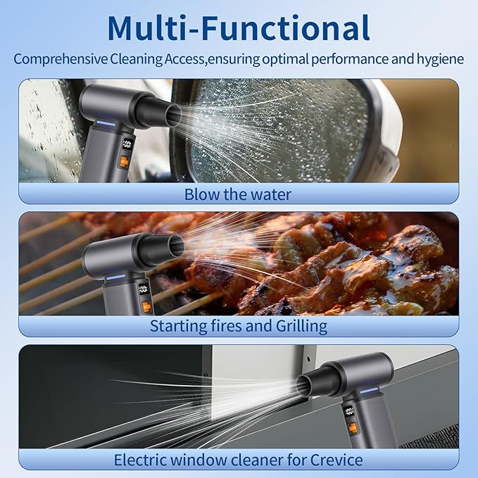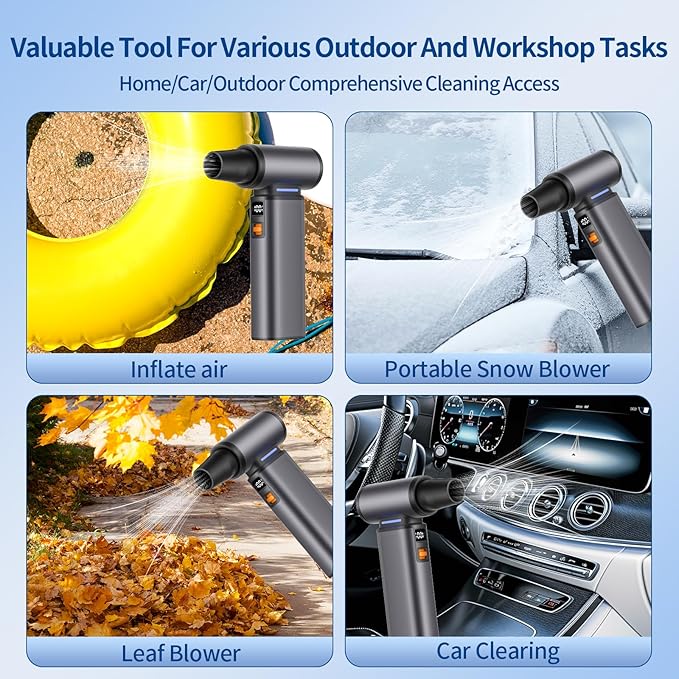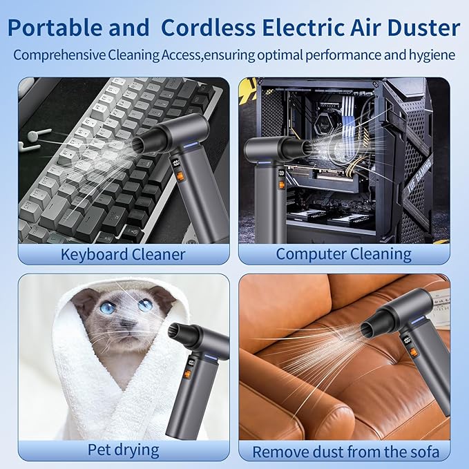 - 【 Cordless air duster Electric 】Air blower Cordless is lightweight only 0.6lb and easy to carry. Mini air gun blower is convenient handheld turbo fan for cleaning,versatile for electronics and various purposes,making it ideal for indoor cleaning,outdoor adventures,travel,and camping.Turbo jet fan is a sustainable and cost-saving cleaning tool to single use dusters for cleaning:pc cleaning kit,compressed air for pc,air duster for computer,electronic air duster,car detailing air blower,computer duster