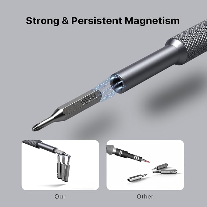 - [Bearing Steel Bits] All precision bits are made of the best Bearing Steel (Steel for tanks) and the hardness can reach over HRC65°, resist abrasion, oxidation and corrosion, ensure long time use. In addition, the strong magnetize-able tip easily pick-up and hold screws, helping you handle all tiny screws.