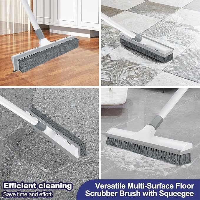 - 2-in-1 Floor Scrub Brush: Effortlessly scrub away stubborn stains with hard-bristles brush, then wipe away dirty water, debris and residue with the built-in rubber squeegee, achieving a deeper clean and rapid drying