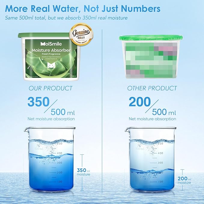 - Efficient Dehumidification: Moismile moisture absorbers for bathroom use high-purity calcium chloride for fast and lasting absorption. Tested to effectively lower humidity from 75% to 55%, effectively humidity absorber. The transparent box allows you to easily monitor moisture collection anytime, making the bathroom moisture absorber work clearly visible.