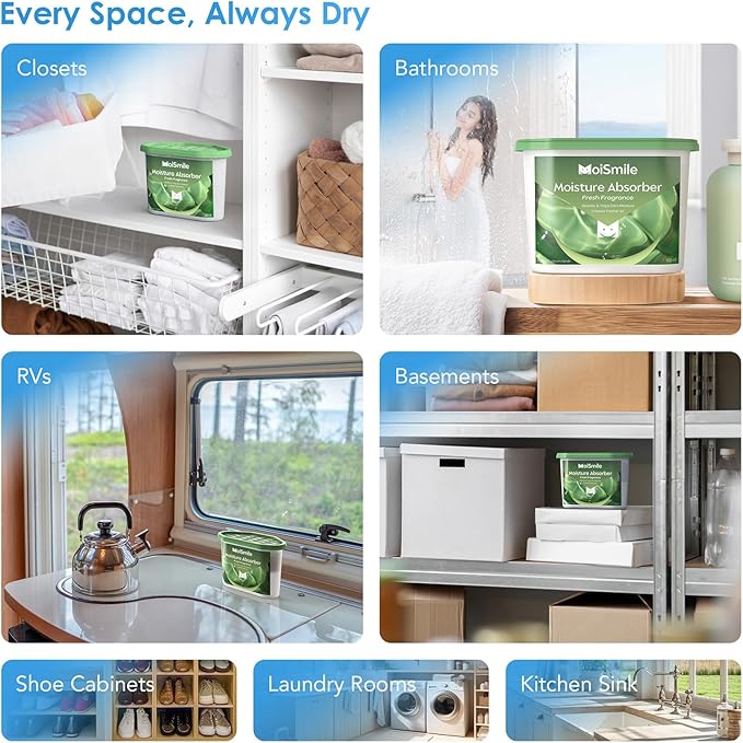 - Portable Use: Moismile moisture absorbers for closet are portable and easy to use, ideal for small spaces like closets, bathrooms, cars, basements, and storage rooms. Just open and place. No power needed. They act as humidity absorber and odor absorber where large dehumidifiers can’t reach.