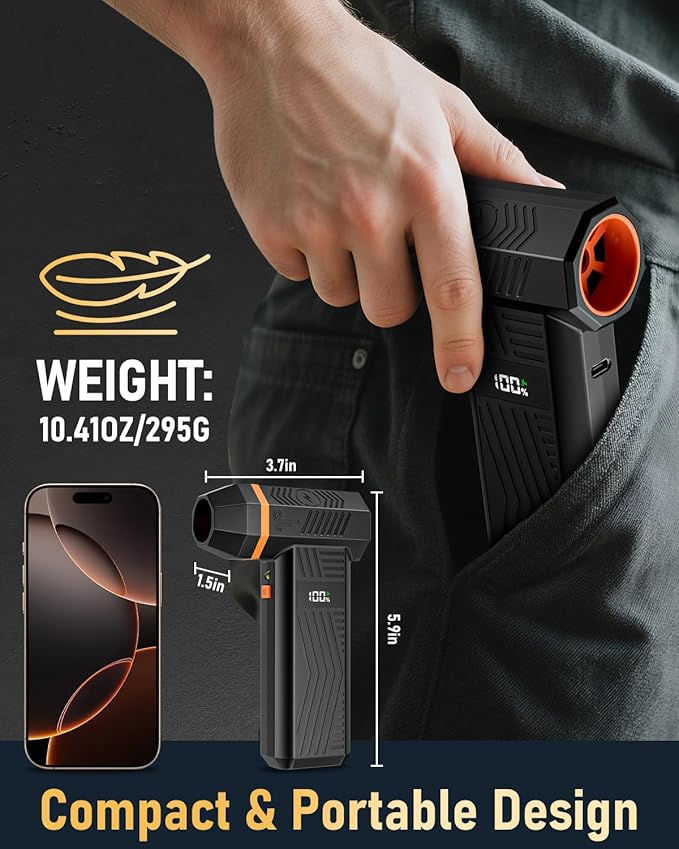 - [Reusable & Portable] Say goodbye to traditional disposable compressed air can! The electric air duster can be rechargeable and used repeatedly, reducing long-term expenses by avoiding the need for frequent repurchases, and minimizing environmental impact. Only weight 10.41oz(295g), it is lightweight and easy to carry, prefect for outdoor adventures, travel, and camping. An eco-friendly, cost-effective, practical and portable air duster blower.