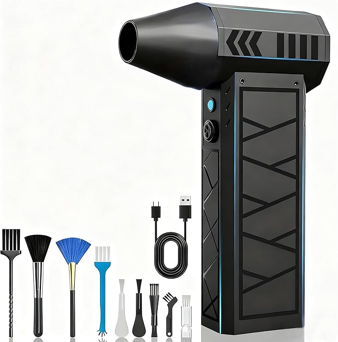 - 【Efficient Air Blower】 This cordless electric air duster achieves a max rotating speed of 130000RPM, delivering super-strong, high-pressure airflow to efficiently remove dust, debris, and dirt from keyboards, computers, and other electronic devices, ensuring robust performance for deep crevice cleaning