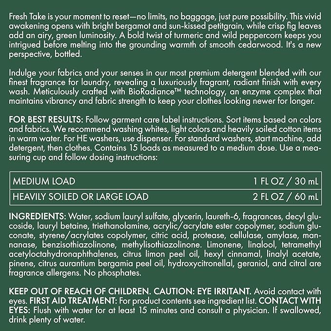 - Complex Laundry Freshness: Your moment to reset—no limits, no baggage, just pure possibility with Fresh Take detergent. This vivid awakening opens with bright Bergamot and sun-kissed Petitgrain, while crisp fig leaves add an airy, green luminosity. A bold twist of Turmeric and wild Peppercorn keeps you intrigued before melting into the grounding warmth of smooth Cedarwood