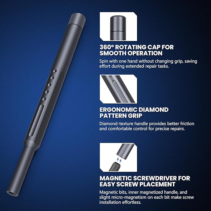 - 【360° Rotating Cap for Smooth One-Hand Operation】 The free-spinning tail cap allows continuous rotation without shifting your grip—ideal for fine electronic repairs and precise workloads.