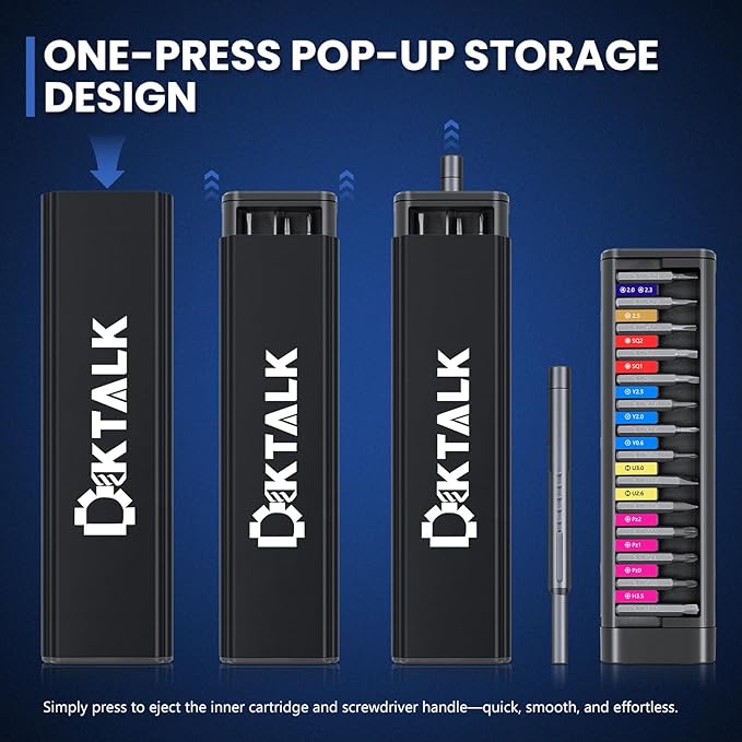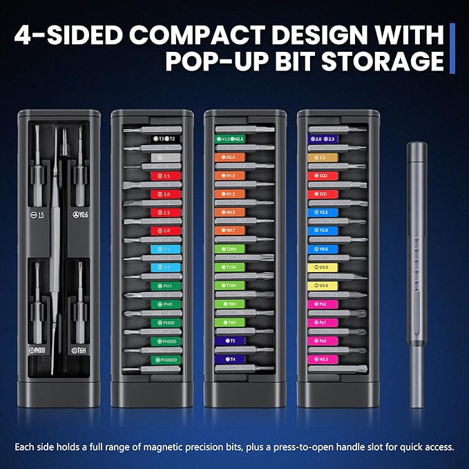 - 【Press-to-Open Pop-Up Storage Case】 Unique press-to-open pop-up mechanism provides instant access to tools. The compact, cartridge-style organizer ensures this mini screwdriver set remains tidy, secure, and highly portable—perfect for everyday carry.