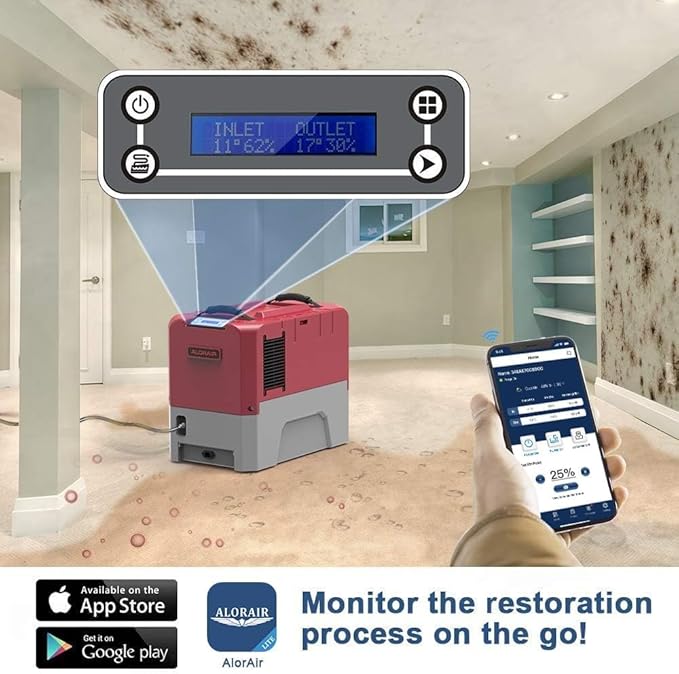 - App Control & Dry anywhere: MONITOR THE RESTORATION PROCESS ON THE GO! Our free AlorAir DryEasy mobile app is included with the unit upon purchase. Commercial Dehumidifier, Moisture Removal Capacity 180 PPD at Saturation condition and 85 Pint at AHAM only with 5.62A, Super-Efficient System, fits into small spaces, Secure, compact stacking – transport multiple units on a hand truck