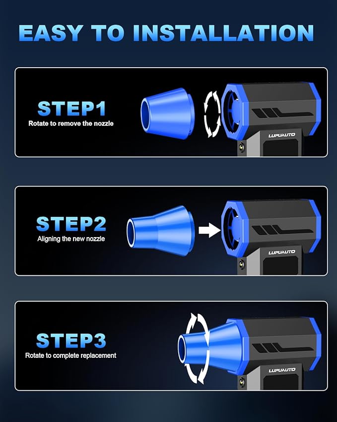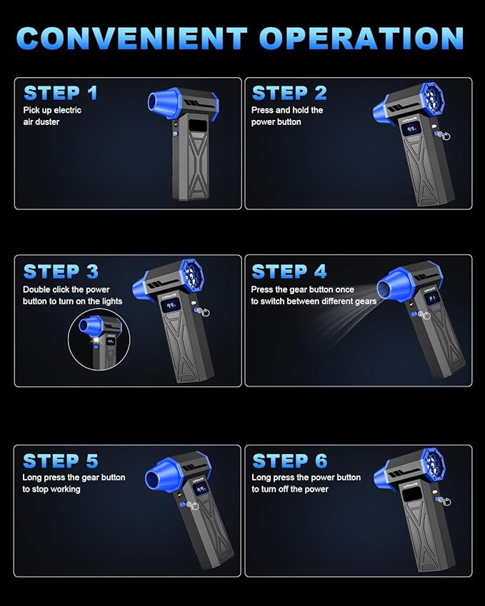 - 【Super Power Turbo Fan for Effective Cleaning】The electric air duster has 4 wind speeds. Press and hold the power button, double-click to turn on the first gear by default, and continue to click to switch to the second gear, third gear, fourth gear and shut down. With multiple nozzles designed to generate varying airflow intensities, you can easily clean hard-to-reach areas and crevices, making this the perfect solution for sensitive equipment maintenance.