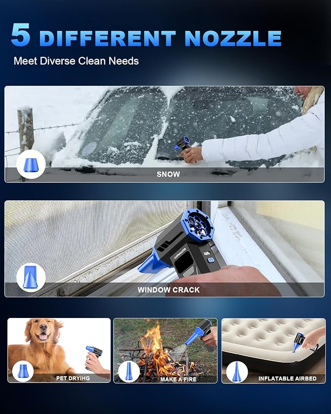 - 【Adjustable Airflow for Versatile Cleaning】The multifunctional dust blower can be used outdoors and indoor, which includes 5 interchangeable nozzles to regulate airflow. Use the flat nozzle for remove debris and dust in keyboard gap, the short nozzle for clean up fallen leaves, snow or outdoor barbecue blowers, the long nozzle to inflate yoga balls and mats. By switching nozzles, you can clean corners and other hard-to-reach places with ease, making this tool ideal for multiple applications.