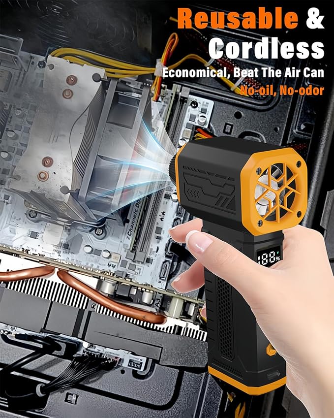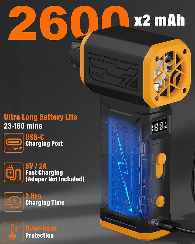 - [ Long-Lasting Battery and USB-C Fast Charging ] - The PC duster built with a high-capacity battery, it provides over 180 minutes of continuous use on low speed. The USB-C port fully charges the device in just 2 hours, making it ideal for outdoor use without the hassle of frequent charging.