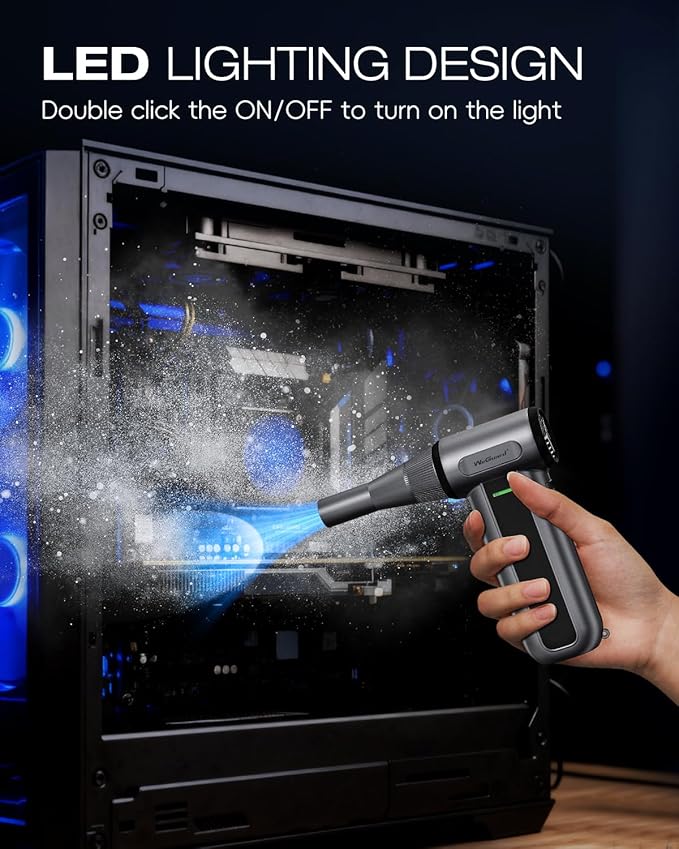 - Bright LED Illumination: The compressed air duster is equipped with an LED light that illuminates hard-to-reach areas so you can easily spot hidden dirt and debris. Double click the switch button to turn on/off the LED light. Do not use the air blower while charging to prevent short circuits.