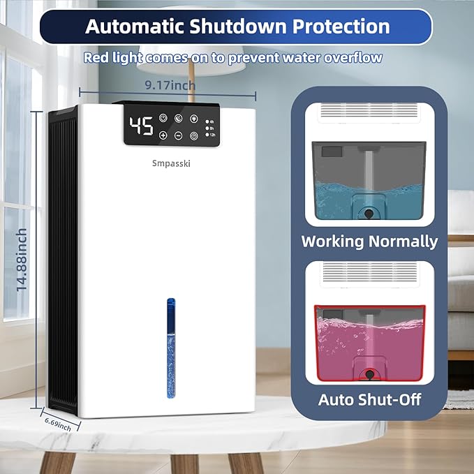- 【Auto Shutoff Protection & Two Drainage Options】The dehumidifier features auto shutoff protection function enhancing home safety. When dehumidifier for basement reaches capacity or in the wrong position, dehumidifier will automatically shut down, an indicator light will to remind you. Furthermore, dehumidifier's removable and Visual water tank makes cleaning easy, and it also comes with a drain hose. Simply connect it for reliable, continuous drainage, completely eliminating leaks