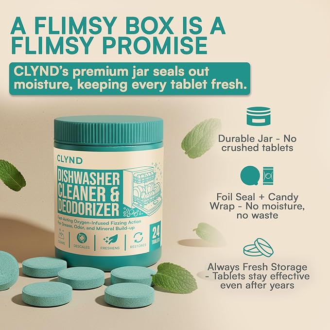 - Controlled Foam Formula. CLYND dishwasher cleaning tablets and deodorizer use oxygen lift action with the right amount of foam against grease and scale, without overflow, leaving a film-free interior for a stronger clean without streaks or haze.