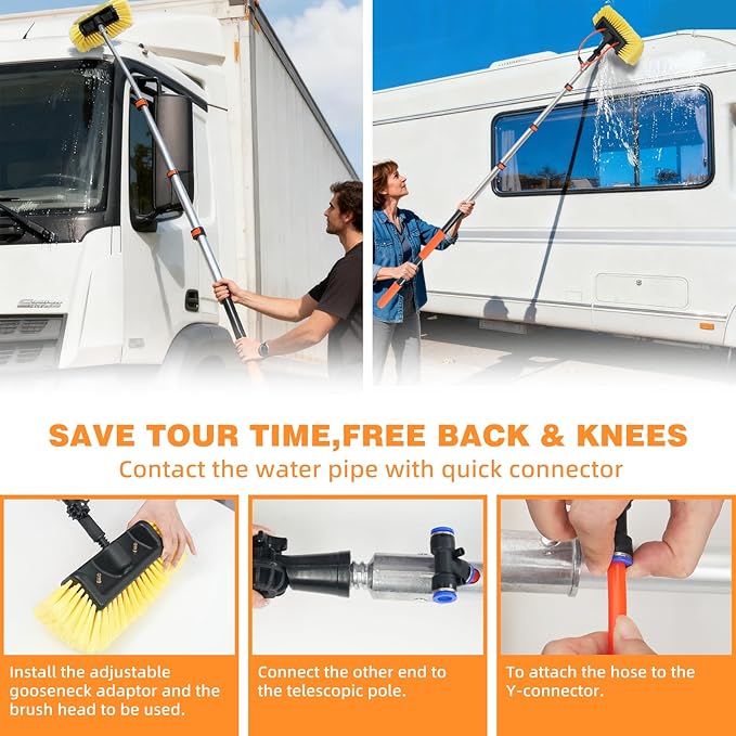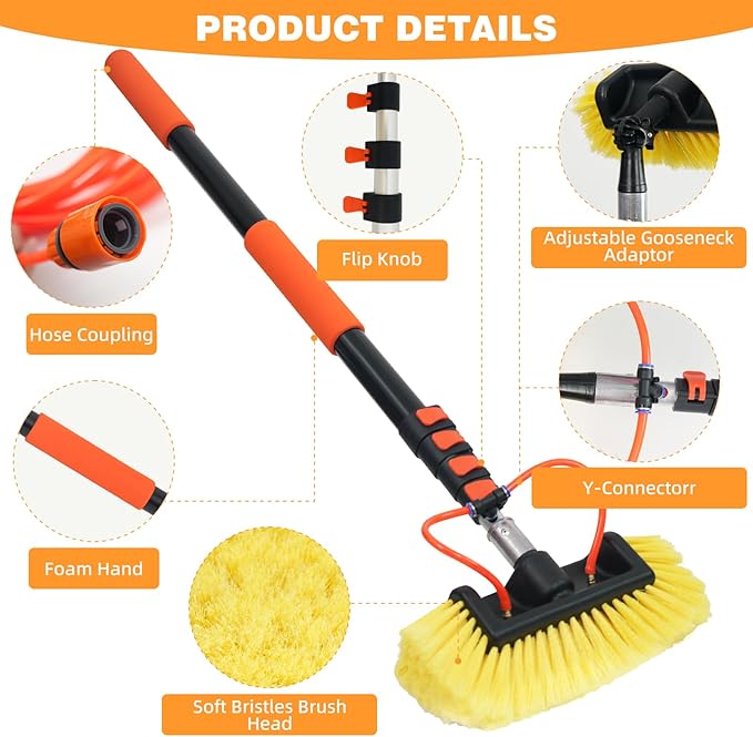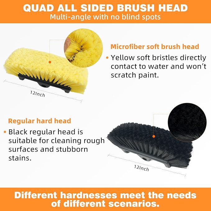 - Ultimate 5 sided: Quad all sided and multi-angle with no blind spots brush head can be contacted to a water pipe to make maximum cleaning more efficient. The Car Cleaning kit includes a yellow soft bristle wash brush and a black hard bristle wash brush with long pole and adjustable gooseneck adaptor,there are 3 telescopic poles to choose : 12ft basic model, 12ft flow-thru model and 20ft flow-thru model.