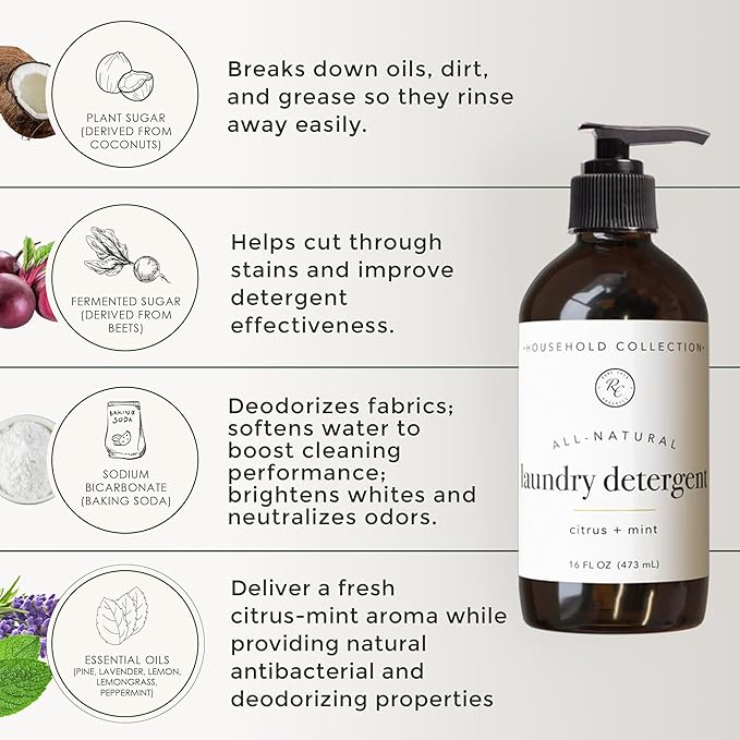 Rowe Casa Organics Citrus and Mint Laundry Detergent Liquid – Natural Liquid Washing Detergent with Refreshing, Crisp, and Bright Scent – 16 Oz Pump Bottle
